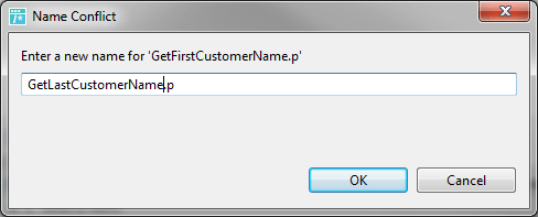 - В окне конфликтов имён измените имя процедурного файла на GetLastCustomerName.p.