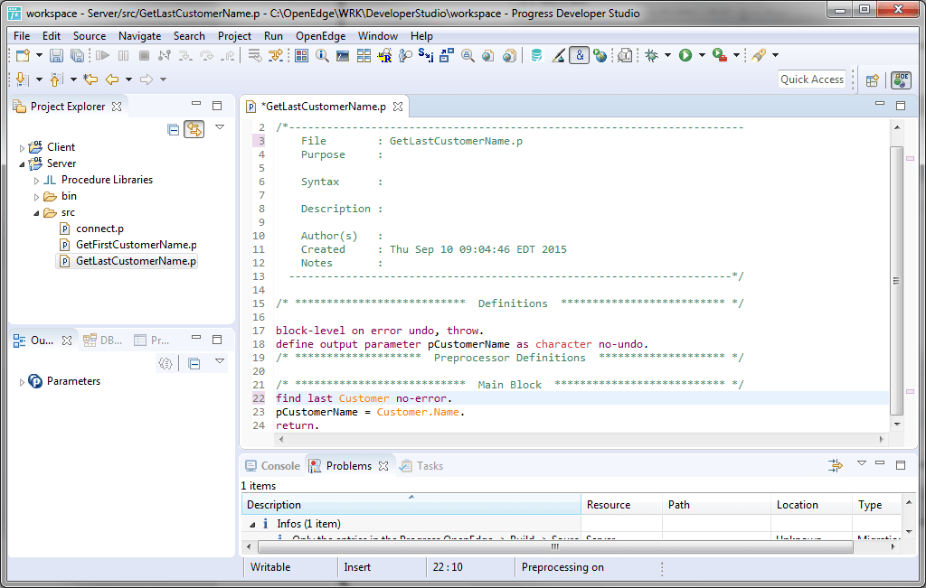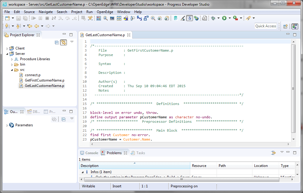 - В Project Explorer щёлкните правой кнопкой мыши по файлу GetFirstCustomerName.p из каталога src проекта Server, и выберите пункт меню Copy.