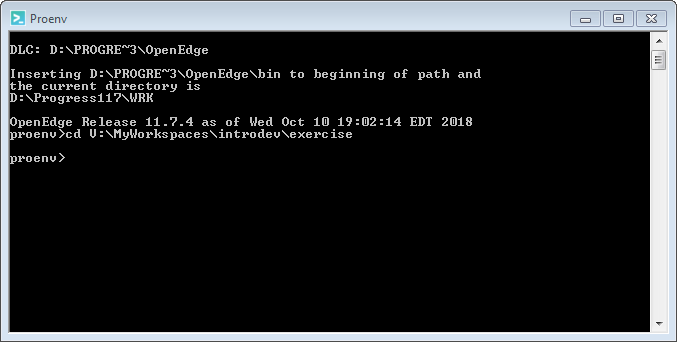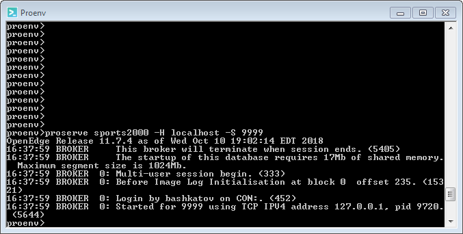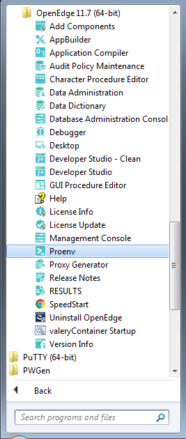 1. Откройте командную строку OpenEdge. Для этого щёлкните в Windows по кнопке Start и выберите пункт Progress -> OpenEdge –> Proenv