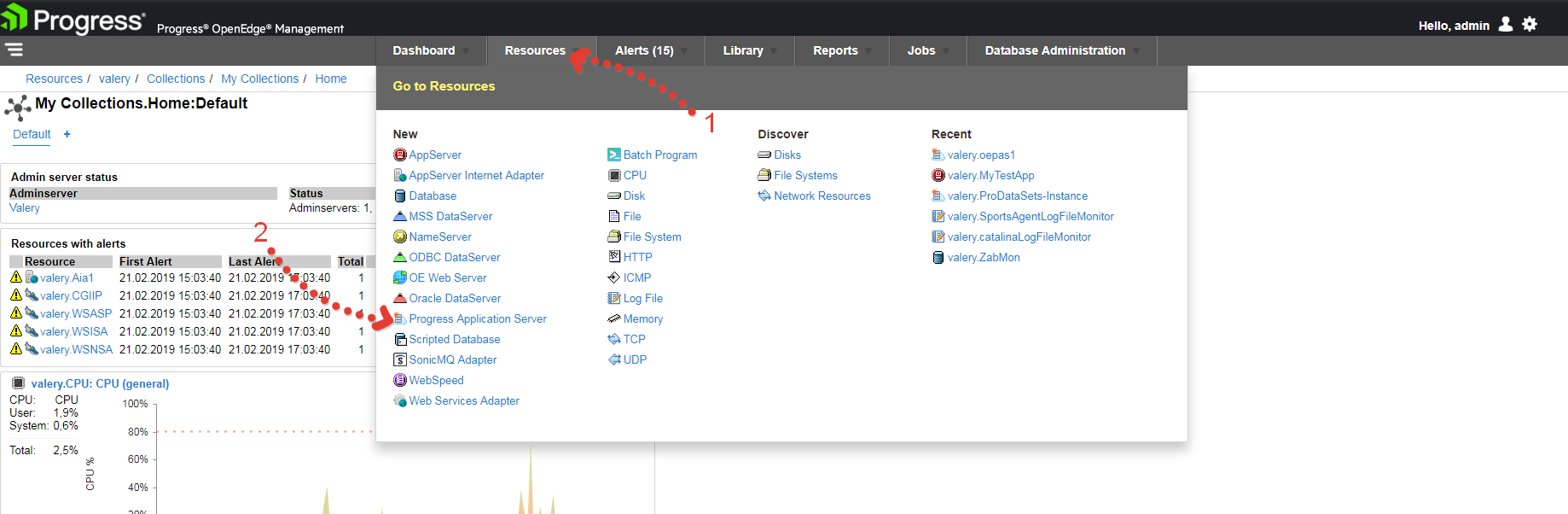 3. После входа в OpenEdge Management откроется главная страница. На этой странице перейдите во вкладку ресурсов и в секции New щёлкните мышь по ссылке Progress Application Server для создания нового экземпляра PAS for OpenEdge.