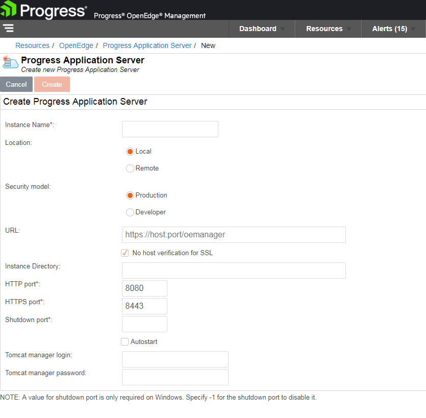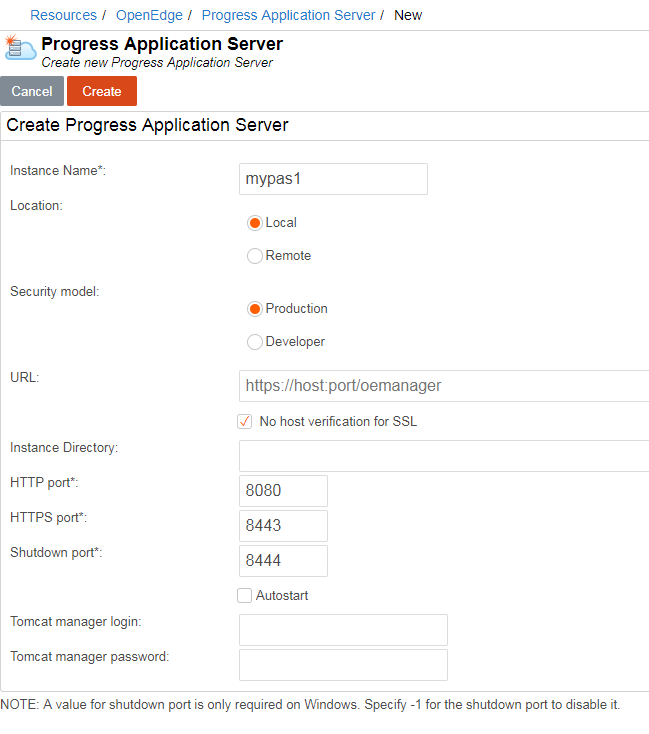 - Instance Directory, здесь введите каталог, в котором будет размещён новый сервер приложений. Если каталог не будет указан, то он будет создан автоматически с именем сервера приложений в рабочем каталоге OpenEdge (%WRKDIR%).